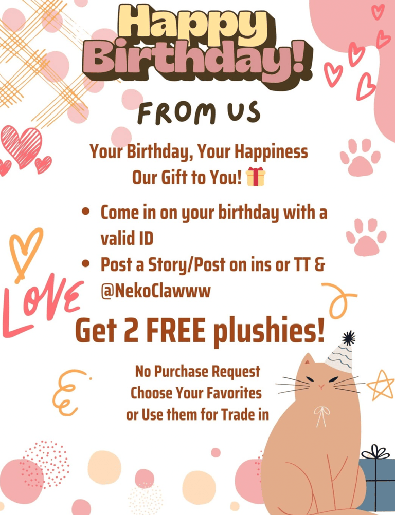 At Neko Clawww, we believe no one should leave empty-handed. That’s why we offer “Fluffing” — our way of making a claw machine a little less challenging when you need a boost. Just ask any staff member and we’ll happily help fluff the machine so you have a fair shot at winning something fun!